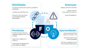 Si hubiera que hacer un borrador de DAFO del joven emprendedor como base para el debate, sugeriría incluir: